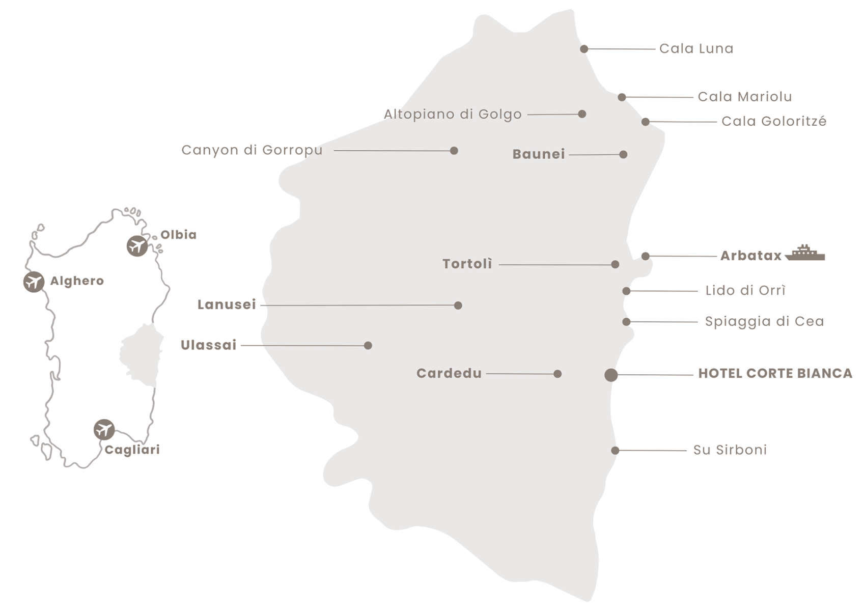 Das Hotel Corte Bianca befindet sich in Cardedu (Ogliastra) im Zentrum der Ostküste Sardiniens. In privilegierter Lage, direkt am Meer, in einem noch unberührten Gebiet Sardiniens mit langen Stränden und einem Hinterland aus typischer, wilder mediterraner Macchia von seltener Schönheit.
